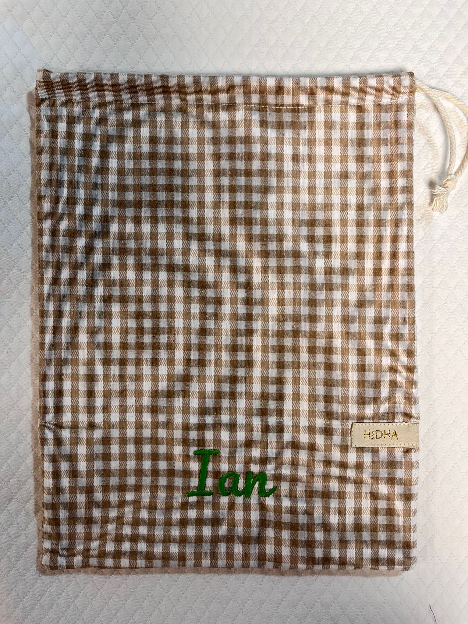 Bonitas bolsitas de merienda personalizadas, para que tu peque pueda llevar la merienda al cole o al parque. Además puedes personalizarla con el bordado que quieras. Tiene un práctico cordón para facilitar el cierre y apertura. Hecha a mano y con algodón 100%