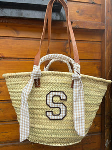 Capazo hecho a mano con palma natural con asas de piel largas y las dos pequeñas forradas, con la tela elegida a conjunto con la inicial que quieras.