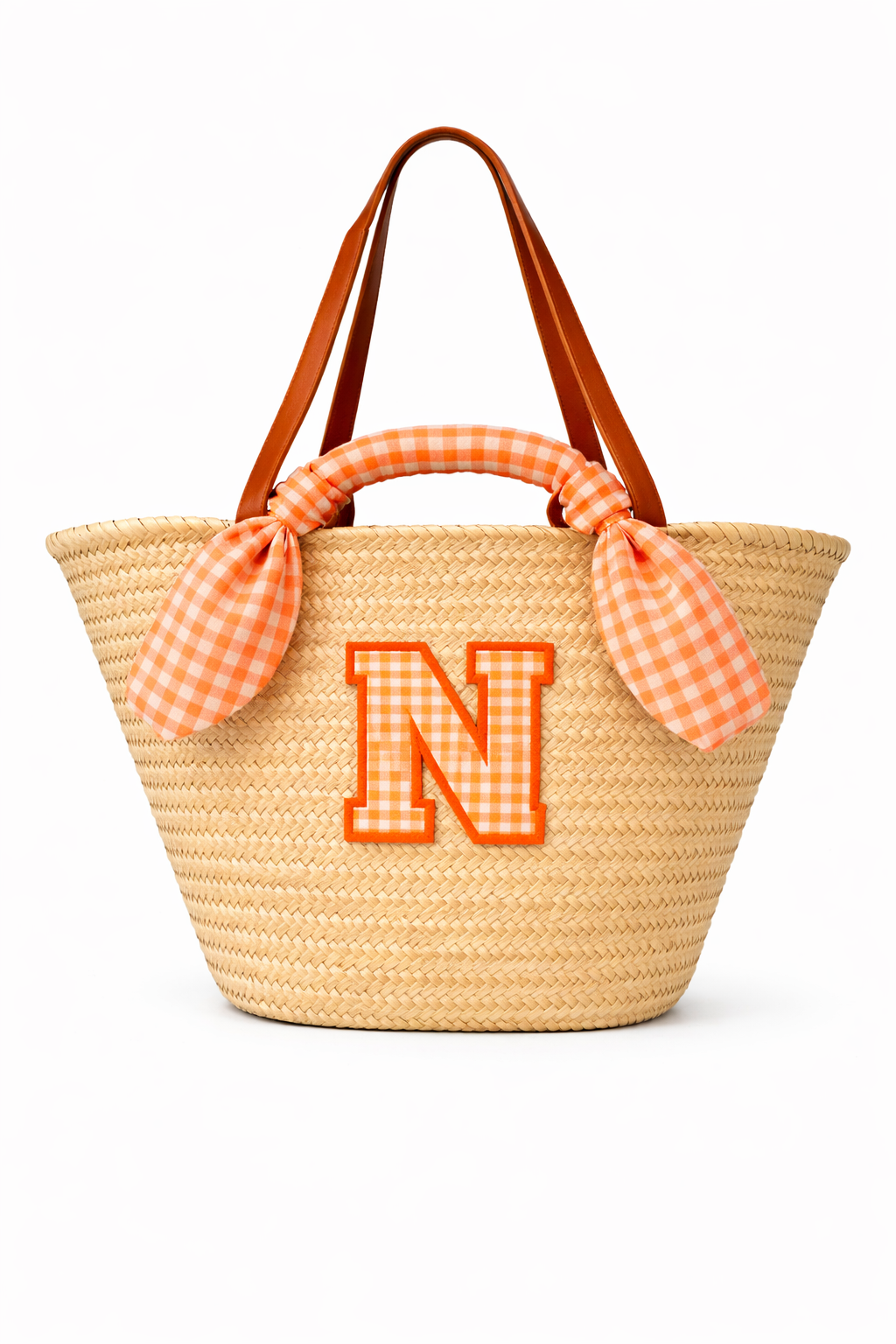 Capazo hecho a mano con palma natural con asas de piel largas y las dos pequeñas forradas, con la tela elegida a conjunto con la inicial que quieras.